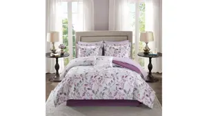 The Lafael full 9-pc. comforter and sheet set offers a charming update for your bedroom. The gray comforter showcases purple and dark gray leaves with a solid purple reverse, for a vivid floral look. Matching shams and an embroidered Decorative pillow accentuate the floral motif. Also included is a purple cotton sheet set with an ogee print that harmonizes with the comforter set. Bringing the best in health and wellness, this bedding set features an anti-microbial treatment - that is safe and non-harmful to humans and the environment - to prevent odors caused by bacteria, reduces the risk of bacteria growth, enhances hygiene, and keeps fabric feeling fresher, longer. This bedding set is also OEKO-TEX certified, meaning it does not contain any harmful substances or chemicals, ensuring quality comfort and wellness.