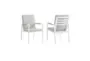 Enhance your outdoor dining experience with the Catal White Metal Outdoor Dining Arm Chair with Teak Accent Set of 2. This modern dining chair set features a light grey color that complements any outdoor space. The combination of aluminum, fabric cushions, and teak ensures durability and comfort for your al fresco meals.