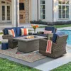The Sonoma Collection is a casual outdoor patio collection designed with wicker consisting of shades of dark brown and light brown for a contemporary blend suitable for almost any outdoor space. This 4 piece swivel loveseat group with a fire pit is handwoven with 16mm half round PE synthetic strands of resin wicker over a fully welded, handmade aluminum frame. Each piece features a multi-step powder-coated finish and supported inner walls, making it built for outdoor performance. The loveseat and swivel glider club chairs feature gently curved arms and square feet that are a continuation of the wicker frame. Paired with deluxe Sunbrella® cushions set upon web seat suspension, this set is a great way to experience the ultimate comfort and style.