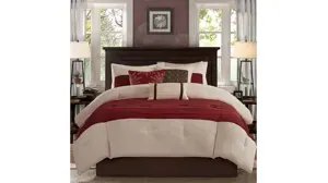For comfort and a chic design, the Palmer bedding collection is the perfect fit. Its khaki comforter is made from pieced microsuede for a soft feel while the piecing details add texture and color with their red and brown details. The decorative pillows add a mix of nature-inspired leaves and solid neutrals to combine perfectly with this collection.