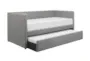 Introducing the Woodwell Grey Leather Twin Daybed with Pull-Out Twin Trundle, a modern and versatile addition to any bedroom or kids' room. Upholstered in sleek grey faux leather, this daybed offers a contemporary look with the added functionality of a pull-out trundle. Perfect for accommodating guests or providing extra sleeping space, this twin-sized daybed is both stylish and practical.