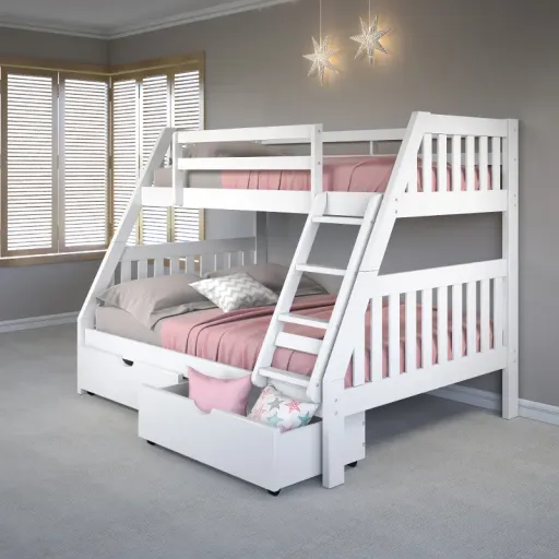 Classically tailored, the white twin-over-full bunk bed with 2 storage drawers exudes timeless charm with its Mission-inspired design. Now at RC Willey, the solid pine construction of this bunk bed provides outstanding durability, while its versatile and time-honored finish pairs well with any décor. Its 2 convenient drawers makes tidying up a breeze! Available for Online Purchase Only. Assembly required. This product ships direct from the manufacturer, so RC Willey Delivery is not available.