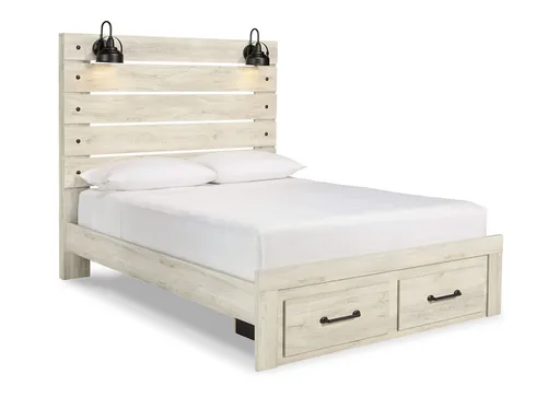 What a delightful take on rustic industrial style. Whether modern loft or modern farmhouse, the Cambeck queen panel bed makes itself at home. The wispy whitewash palette enhances without covering the grain for that weathered look you crave. Love to read in bed? You’re sure to find the retro-chic light sconces and USB plug-ins on the open-slat style headboard such a bright idea. Elongated drawer pulls on the footboard storage drawers elevate the aesthetic.