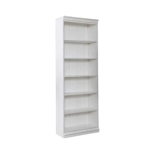 The Magnolia Manor 84 inch bookcase is a timeless piece that seamlessly blends classic design with modern functionality. Crafted with meticulous attention to detail using Rubberwood solids with White Oak and Birch veneers, this piece features an Antique White finish with heavy distressing. The bookcases standout feature is a heavy top and base crown, adding a touch of grandeur and stability to the overall structure. Five fixed wood shelves offer sturdy support for your books, collectibles, and more, while against a planked back panel, providing a rustic backdrop that enhances the bookcase's visual appeal. Designed to withstand the test of time, this bookcase combines durability with elegance, making it a versatile addition to any living room, home office, or study. Whether you're showcasing your favorite novels or organizing important documents, the Magnolia Manor 84 inch bookcase offers both style and functionality in equal measure.