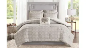 Style your bedroom with the shabby chic allure of the Malia Comforter Set. The face of the reversible comforter features tufted grey embroidery on an ivory base, while the reverse showcases an all-over grey medallion print that complements the top of the bed. Two matching shams mirror the face of the cotton comforter and two grey shams match the reverse of the comforter. An embroidered medallion design on the square decorative pillow provides an elegant finishing touch to the cotton comforter set. Machine washable for easy care, this reversible comforter set is made from 100% cotton and provides a comfortable shabby chic update to your bedroom d_cor.