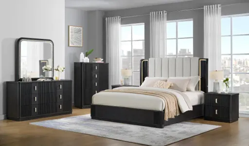 Add elegant, refined style to your bedroom spaces with the Treviso collection. Beautifully crafted, this king-size platform bed combines graceful curves and clean lines for a modern feel with a subtle nod to Art Deco design. The rich espresso finish is beautifully complemented by upholstered paneling on the headboard and is illuminated by convenient lighting. Includes headboard, footboard, and rails.