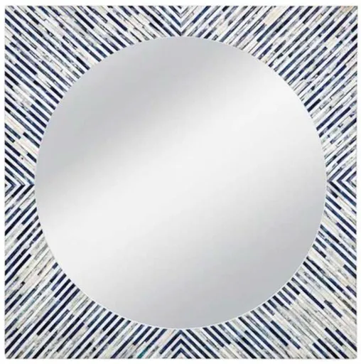 The Sunburst Bone Wall Mirror showcases an angled blue and white bone inlay framing a round mirror within a square frame. Its blue and white bone finish adds a striking touch to any space.