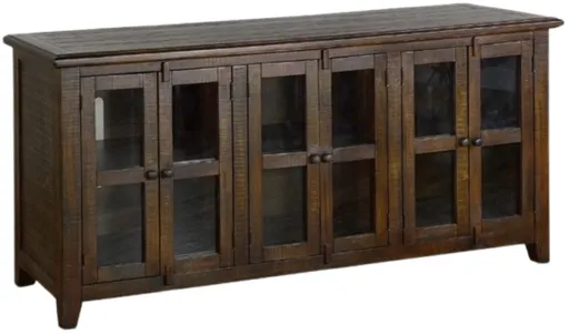 The Sunny Designs Tobacco leaf 70″ tv console blends rustic charm and refined craftsmanship. Crafted from rough-sawn mahogany solids and veneers with a warm tobacco leaf finish, it features four glass-front doors, three adjustable shelves, built-in cord-management vents, and a generous 70" widthideal for anchoring your entertainment setup.