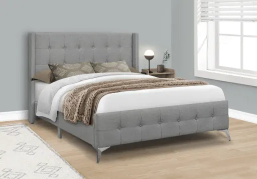Create a refined sanctuary in your bedroom with the Chadley collection! This queen-sized bed frame is covered in a neutral gray linen-look fabric over foam cushioning on all sides, with elegant button tufting on both the curved headboard and footboard for a luxurious appeal. The support legs are covered with the same gray linen-inspired material for an attractive finish, and the curved chrome metal feet at the footboard give the whole bed that hint of modernity and glam. Available for Online Purchase Only. Ships Directly from the Manufacturer. RC Willey Delivery is Not Available. Assembly required.