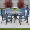 Get lost in the oversized comfort and structurally sound furniture of our exclusive Fairmont Collection. Feel the cool touch of the handmade aluminum frame, featuring a multi-step powder-coated and oven-baked clear coat finish. Each piece in this 5 piece dining set is constructed by laser welding to create fully welded and braced frames with zero weld marks. The dining chairs feature high-back seating and are comprised of quick-drying, sling material with speciality yarns woven in twill and horizontal line patterns. The 48 in. round dining table features 6 in. slats and an x-shaped base support for extra stability.