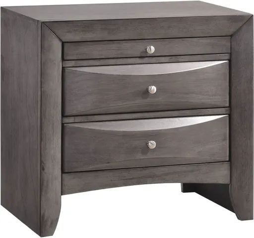 This nightstand blends modern charm with practical design. Built with a mix of solid wood, engineered wood, and Okume veneer, it features a smooth gray finish, English dovetail drawers, and sturdy Kenlin glides. Metal handles add a sleek touch to this durable bedside essential.