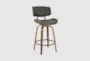Introducing the Lofi 26" Counter Height Stool with Swivel in walnut wood and grey faux leather. This set of 2 stools is ideal for your dining room or kitchen, offering a mid-century modern style that is both functional and stylish. Featuring a curved design and comfortable seating, these stools are perfect for any tall counter or bar.