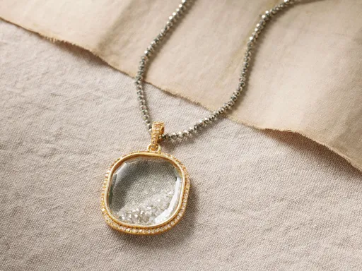 Artisan-made from gold-plated sterling silver, this brilliant necklace features a clear pendant housing dazzling loose diamonds and pyrite that catches the light with every movement, creating an elegant, luminous effect.