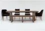 Enhance your dining experience with the Estate Brown Wood 80"-104" Extendable Dining Set. This traditional set includes a bench and upholstered host and side chairs, perfect for seating six. The estate oak finish and solid rubberwood construction ensure durability and timeless appeal.