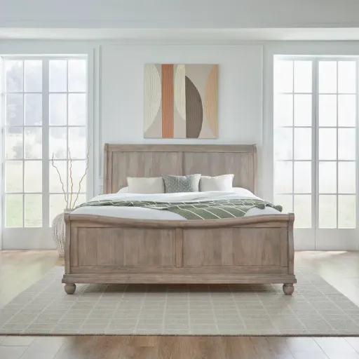 The Traditions collection pays homage to heirloom craftsmanship with its enduring silhouettes and rich detailing. The California king-size bed draws inspiration from classic Louis Phillippe styling and is expertly crafted with a welcoming saddle tan finish. Its sleigh-inspired design and timeless bun feet promise to add classic, inviting charm to your bedroom space. Includes headboard, footboard, and rails.