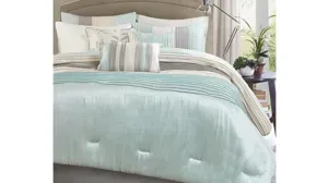 Amherst Comforter Set's modern color blocked design is a simple way to add style to your room. This comforter is covered in larges stripes in shades of aqua and grey. Made from polyester and a brushed fabric reverse this comforter is soft to the touch and is machine washable for easy care. The comforter set includes two matching standard shams and three decorative pillows that accent the color blocked look.
