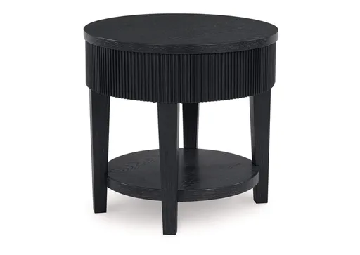 Classic and cool in dark charcoal, the Marstream end table brings contemporary convenience to your living room. Short on storage? The trendy reeded apron conceals a drawer perfect for remotes, controllers and other entertainment accessories. What a perfect marriage of style and functionality.