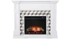 Blend classic style and modern convenience with this freestanding Enright Fireplace. Sleek marble forms the unique surround pattern, bringing contemporary flair to your family room or dining area. Flickering LED flames craft a realistic fireplace look in your space, while glowing faux fire logs add ambiance, with or without heat. Spend cozy evenings around the fire when you bring home this small space electric fireplace. <strong>Do not place TV on Mantel.</strong>