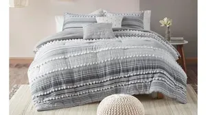 Give your bedroom a soft casual update with the Calum 5-pc. Comforter Set. The cotton clipped comforter features yarn-dyed stripes of tonal grey and off-white, for a soft and alluring look. Matching shams (1 for Twin Sizes) mirror the design seen on top of the bed, while two decorative pillows add the finishing touches to the bed. Hypoallergenic polyester filling in the comforter and pillows provides exceptional warmth and comfort. Easy to coordinate with, this cotton comforter set brings a rich textural look and feel to your bedroom decor and is machine washable for easy care.