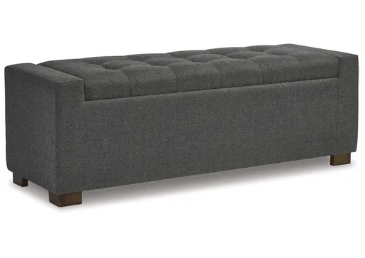 Whether gracing a front entry or living room, or placed at the foot of the bed, the Cortwell upholstered storage bench is loaded with flair. Tufted cushioned seat with hinge reveals an ample storage compartment for this, that and the other. Gorgeous gray fabric is the epitome of neutral sophistication.