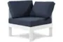 Introducing the Lucas Navy Water Resistant Fabric Outdoor Patio Aluminum Corner Chair, a perfect addition to your modern outdoor space. Designed for comfort and durability, this armless corner chair is ideal for any patio, deck, or terrace. Its navy water-resistant fabric ensures that it can withstand the elements while providing a cozy seating option.