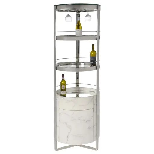 The Eliza Marble Bar Cabinet is perfect for entertaining. This impressive collection cabinet boasts a clear tempered glass top, mirrored glass inserts, a polished stainless steel frame, and engineered wood and veneers. It offers wine bottle holder shelves, as well as a storage drawer. Plus, it has built-in finger pulls for ease of use. Part of the Carlo Perazzi collection, this storage cabinet is sure to turn some heads.