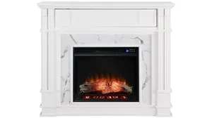 Cozy up to traditional style with this white smart Caufield media fireplace. Linear woodwork encapsulates crisscross hatching of lifelike granite veneer. Designed as an entertainment console, this electric fireplace fits beautifully beneath a wall mounted TV, while a recessed door shelf hides the mass of media equipment. This electric fireplace saves energy with long-lasting, cost-effective LED bulbs, while igniting ambience with realistic flames and supplemental heat. <strong>Do not place TV on Mantel.</strong>