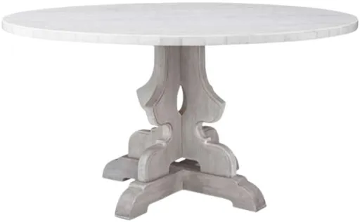 The Bassett Mirror Delaney White Dining Table features a sophisticated white tabletop paired with a contrasting gray base. Its clean, modern design brings a fresh, stylish appeal to any dining room, combining functionality and elegance for a versatile centerpiece.