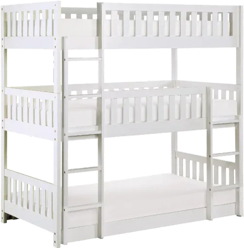 Create a stylish centerpiece in any bedroom space with the Oakley collection! Solidly crafted, this triple twin bunk bed allows you to free up precious floor space while providing ample sleep surfaces. Its clean lines and enduring silhouette are finished in a neutral and breezy white color that will effortlessly enhance a variety of decorating tastes! Includes triple twin bunk bed with ladders, guardrails, and 3 twin-size decking pieces for mattress support.