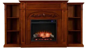 Boldly ignite your living area with this ornately detailed, classically carved Drennan Fireplace in autumn oak. Bookending shelves echo the molding on the mantel and provide ample storage for reading materials, media accessories, or pottery. Glowing faux fire logs add ambiance with flickering LED flames and lifelike embers, with or without heat. Traditional styling combines with modern flames to make this fireplace a must in every home.
