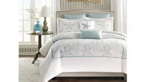 Bring the ocean into your home with the Maya Bay Collection. A soft seafoam blue is the accent color used in this beach themed duvet cover and shams playing up the seashell and sand dollar embroidery. Made from 200 thread count cotton, this calming collection allows you to escape from reality in your own home. <br /><br />A duvet cover is a protective cover for your comforter, most likely for your down comforter. Sometimes it's referred to as a comforter cover. Duvet covers are not filled. It has an opening where you can insert your comforter. Filler not included.