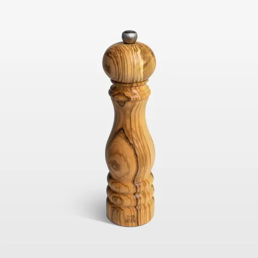 This striking pepper mill makes the most of olivewood's expressive grain with ornately turned curves. Each mill is crafted from a single piece of olivewood and finished with oil for a velvet-like touch. Turning the knob adjusts the size of the grind—clockwise for a finer grind, counterclockwise for coarser. Due to the characteristics of natural wood, the contrasting veining of each pepper grinder will be unique.