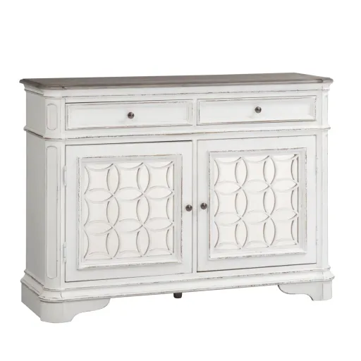 Make entertaining easy and stylish with the Magnolia Manor Buffet. Crafted of poplar solids with white oak and birch veneers. The buffet top features a weathered brown finish accented by an antique white with heavy chipping. Two fully stained full extension drawers with felt lining create storage galore when combined with the two antique mirrored doors that feature one adjustable shelf behind each doors. The mirrored doors offer design flexibility with a decorative grid insert and the option to switch the mirrored door to a wood panel. Canted corners and bead molding round out this beautiful piece that works in any décor from farmhouse to cottage living.