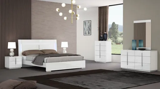 Euro is proud to introduce our newest addition to our thoughtfully crafted bedroom sets. The Tulla premium bedroom set features a superb design which integrates sophistication with simplicity. Crafted in white Lacquer, featuring LED lights on the headboard this set is adorned by clean chrome handles for just the right look. The case goods feature premium soft close drawers, and the bed features a full wooden platform to eliminate the need for a box spring.