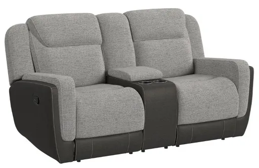 The Hornet Motion Loveseat with Console in Rancho Grey offers comfort and functionality with its reclining seats and built-in storage console. Upholstered in durable, soft fabric, it provides cozy seating and convenience, perfect for relaxing and entertaining in any living space.