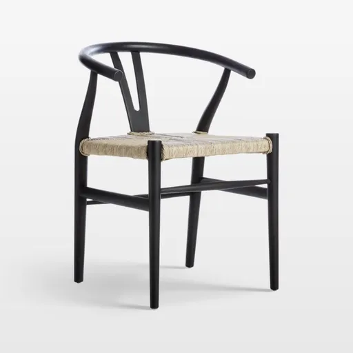 Inspired by traditional Chinese design, this modern design classic goes all natural for sophisticated dining. Fashioned with its signature Y-back and semi-circular arms, the dining chair gets a fresh dose of texture with a woven synthetic wicker seat on a frame of black-finished teak.