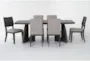 Elevate your dining experience with the Astra Black Dining Set, designed to comfortably seat six people. This modern set includes four grey upholstered fabric chairs and two additional wood chairs, all featuring a sleek, armless design. The rectangular table and chairs come in a sophisticated black heron color, adding a touch of contemporary style to your dining room or kitchen.
