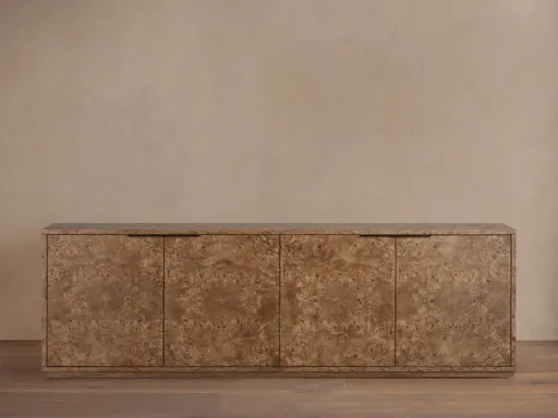 Transforming from accent décor to focal point in any room, our Corey Sideboard is a versatile piece that fits seamlessly into any home aesthetic. Eye-catching burl wood prized for its unique beauty is hand-finished to illuminate every swirling wood grain detail with warm honey or rich brown color tones. Resting on a modern platformed plinth, the Corey Sideboard combines textured warmth with modern style to create a dynamic statement wherever your décor leads.