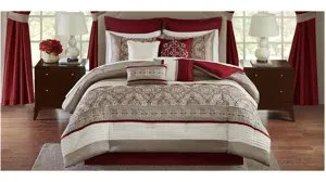 Update your entire space instantly with the Jelena 24 Piece Room in a Bag. The bold red base on this comforter works beautifully with the soft white and red piecing. Decorative embroidery adorns the bottom portion of this comforter and the center of each sham creating a rich look in your space. Four solid red window panels, four taupe tie backs and two embroidered valances accompany your new bedding for a whole room makeover. Four embroidered decorative pillows, two shams and a bedskirt put the finishing touches on this complete look.