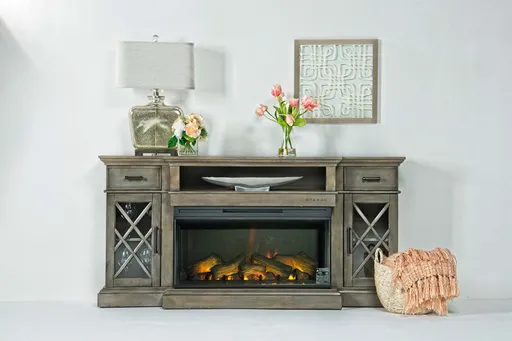 Enjoy the beauty of realistic fireplace flames and high-tech heating without the need for logs or natural gas. This gorgeous Harbor Fireplace Console in Gray features a three-sided glass display of the ClassicFlame electric fireplace, giving you a great view from any spot in the room. The brilliant, dancing 3D flame effects lend a beautiful, relaxing atmosphere for any room of your home. The flames operate separately from the 5,200 BTU heater, so you can enjoy the view on warm or cold days. Use the remote control to customize your fire’s look, choosing from five colors, five brightness settings and five speed settings. You can go from a subtle glow and low flames to a roaring fire, matching your mood. This room-transforming console accommodates up to an 80” flat screen TV, and its built in storage lets you keep your electronics in one place and tidy. This console is the perfect addition to any traditional or eclectic space with its breakfront profile, attractive lattice mullions on the storage doors, and plinth base. Product Details: • Great addition to any room of your home • Supports most flat screen TVs up to 80” and 155 lbs with extra space for electronics • Wireless remote included • Fireplace insert includes a 5200 BTU heater for large spaces up to 1000 square feet • Quartz infrared heating element maintains humidity during heating • PanoGlow 3-sided glass fireplace display for you a flame view no matter where you are in the room • Safer Plug feature monitors the plug temperature and shuts off automatically if the plug gets too hot • Invite a relaxing, romantic element to your decor, soon to become your favorite spot in the house • Spectrafire flame effects offer multiple different fire visual effects, including brightness, speed and colors • Illumitouch digital control gives you a seamless, embedded digital readout • Made from quality wood veneers in an on-trend, gray color with antique black hardware • Use the two drawers and two side cabinets with adjustable shelves to keep your space organized Dimensions: • 70”W x 17.375”D x 34.375”H