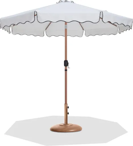 Escape from the sun's rays when you're basking beneath this Amalfi white fabric with black piping and teak aluminum patio umbrella with base set. This umbrella and stand is an ideal option for adding shade to any area of your deck or patio. The aluminum pole weathers the elements with ease and is finished in teak for a resort-inspired look. The umbrella's fabric is water and color-fade-resistant, ensuring lasting beauty in your outdoor space. Available for Online Purchase Only. Ships Directly from the Manufacturer. RC Willey Delivery is Not Available. Assembly required.