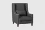 The Raymond Dark Grey Accent Chair is a traditional-style indoor wingback chair with tapered legs, track arms, foam cushions, and a tight back and arms, upholstered in dark gray fabric with nailhead trim, a high back, and lumbar pillow included, made of wood, engineered wood, foam, and fabric, requiring assembly. Ideal for use in living rooms or bedrooms. This design is the perfect bedroom chair, reading chair, club chair or accent chair for living room.