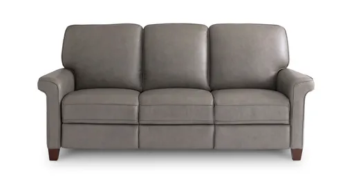 Youd never know that the lovely legs and roll-over, club-style arms of this Dixon Reclining Sofa and Loveseat hide complete head and foot reclining capabilities. The Dixon seating collection includes a loveseat and three-cushion sofa in light-grained Graphite leather, with both pieces featuring two reclining seats. The full-panel (vinyl match) back allows for total design flexibility as you are room planning -- set your sofa a mere 8” from the wall or opt to add a battery pack so you can float it anywhere. Each reclining seat has a switch-operated Power Adjustable Headrest and Extended Footrest that can be optionally augmented to Bluetooth remote capability. Let your living room live up to its name by setting the standard for stylish comfort.