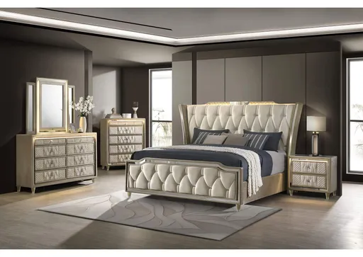 Unite form and function in this bedroom set, where sculpted glamour meets modern refinement. Each piece is wrapped in ivory and camel velvet with quilted textures, crystal knobs, and reflective acrylic accents. The dresser features a clear tempered glass top and LED case lighting without the fireplace insert. Combined with the LED wingback bed, USB nightstand, and tri-panel mirror, the set delivers soft sophistication with everyday practicality.
