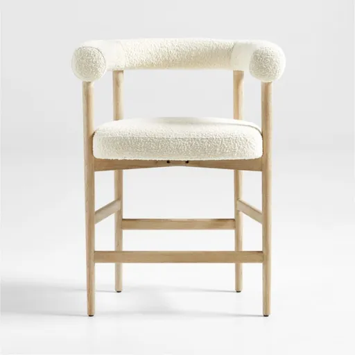 Our Mazz counter stool puts comfort and cool factor into contemporary design. Playful proportions take shape in the ultra-slim, whitewashed wood legs and oversized, tubular cushion that flows seamlessly from arm to back. Designed for comfort as well as eye-popping good looks, the stool relaxes with a generous, well-cushioned seat and white bouclé upholstery.