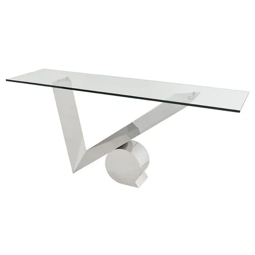 The V-Console Table combines a tempered glass top, polished stainless steel, and a V-shaped base to create unique modern design for your living room or entryway.