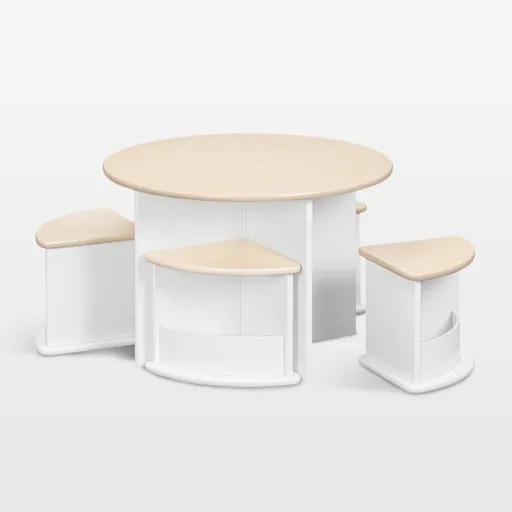 Babyletto's Nessa nesting play table is ready for every art project, tea party and block tower. The round, low-profile table pairs with four pint-sized chairs that have built-in cubbies to hold toys, books and art supplies. When not in use, the chairs tuck neatly underneath to free up valuable floor space. The compact design keeps kids' spaces tidy, while the warm wood finish and playful silhouette bring modern style to the playroom.