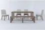 Introduce a touch of rustic charm to your dining room with the Luis Natural Rectangular Wood 72-90" Extendable Dining Table With Bench + Upholstered Chair Set For 6. Crafted from acacia wood, this set combines durability and style, making it perfect for family gatherings and dinner parties. The natural finish highlights the beautiful wood grain, creating a warm and inviting atmosphere.
