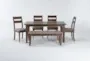 The Elle Brown Rectangular Wood 65" Kitchen Dining Table with Dining Bench and Side Chair Set is perfect for your dining room or kitchen. This mid-century modern set features a mahogany brown finish and includes a dining table, bench, and side chairs with grey removable cushions. The solid acacia, acacia veneers, and engineered wood construction ensure durability and style for years to come.