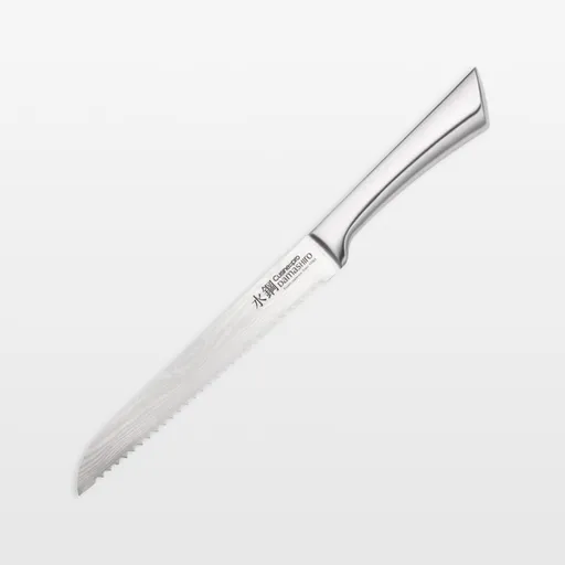 Cuisine::pro's Damashiro knives feature stunning Damascus-style patterned blades suggestive of flowing water and handles inspired by Japanese samurai swords. Made of ice-hardened Japanese steel, the blades are tough, shatter-resistant and honed by traditional methods to a fine, razor-sharp, edge. With its perfectly balanced hollow handle, the serrated bread knife saws through crusty loaves or tomatoes without tearing or crushing.